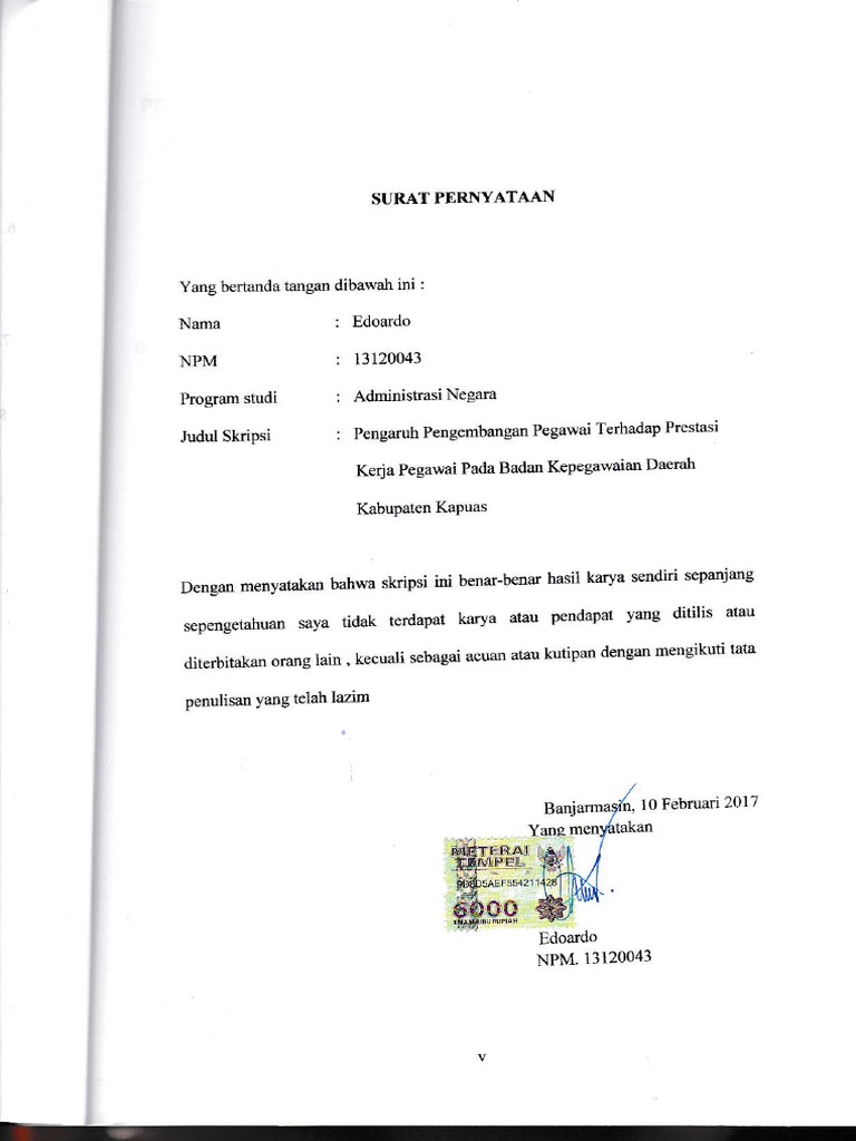 Surat Pernyataan Keaslian Skripsi from imgv2-2-f.scribdassets.com Surat pernyataan adalah surat yang di buat guna memberikan sesuatu pernyataan. Sesuai dengan tujuan dan kegunaan surat pernyataan tersebut dibuat. Dengan ini saya menyatakan bersedia menyelesaikan skripsi dengan syarat dan ketentuan yang telah ditetapkan oleh pihak kampus. Isi surat pernyataan cerai berisi tentang pernyataan bahwa kedua belah pihak sepakat untuk bercerai. Skripsi sebagai salah satu syarat untuk menyelesaikan strata 1 pendidikan di indonesia, sangatlah wajib untuk menuliskan surat pernyataan keasilian dari hasil penelitian yang dilakukannya. Tujuannya adalah agar tidak merugikan kedua belah pihak seandainya pernyataan yang disampaikan merupakan kebohongan atau tidak ditepati. Contoh surat pernyataan perusahaan, surat perjanjian, serta cara membuat surat pernyataan. Contoh surat pernyataan salah transfer uang bank perusahaan dan pribadi january 24th 2018 contoh surat surat pernyataan transfer uang kini semakin dipermudah dengan banyaknya layanan yang ditawarkan mulai dari teller atm e.